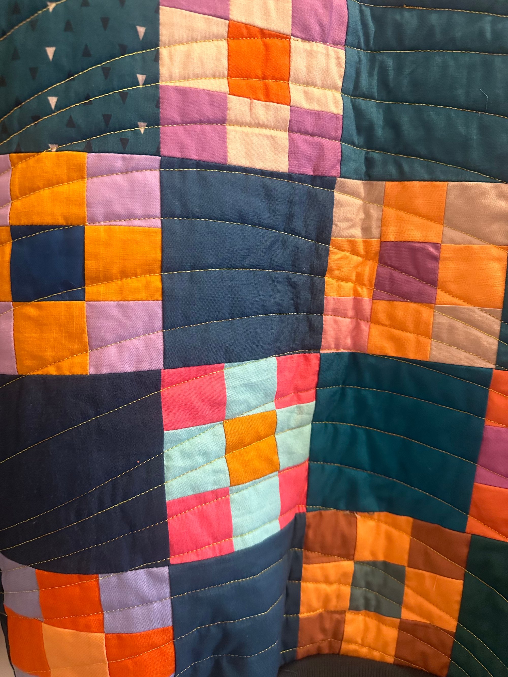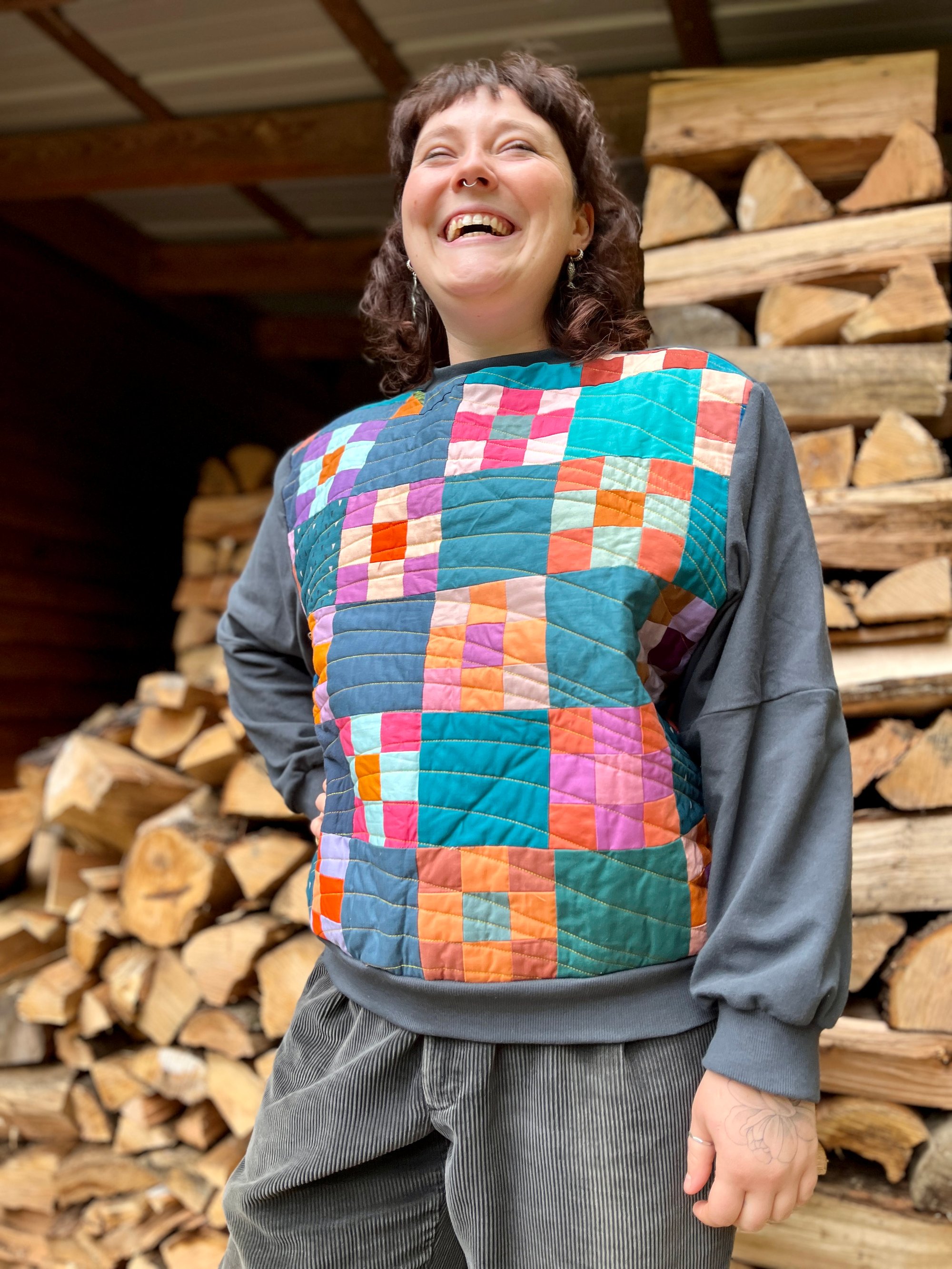 Hand pieced and machine quilted using second-hand cotton, organic american-milled french terry, and cotton rib knit. A perfect gift for your beloved, yourself, or your neighborhood crush. This piece is part of a limited collection made in collaboration with Rae Heller, an artist and quilter based in Vermont.