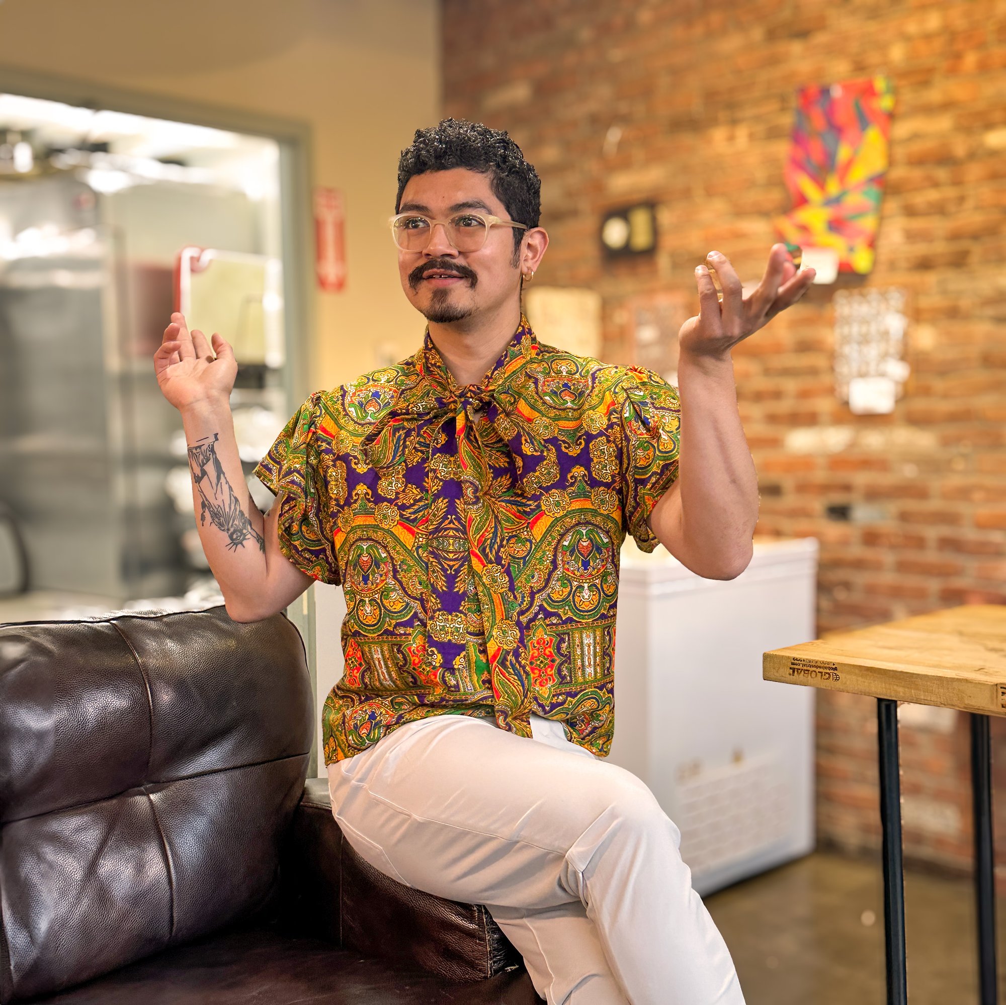 Made from a second-hand Nieman Marcus skirt, this pull-over shirt features a bold print, ruffled sleeves, and a BIAS handmade signature bowtie neck. Style it with masculine, feminine, or neutral pieces to affirm where you are on the gender spectrum. Wear it to work, running errands, or to an evening soiree.